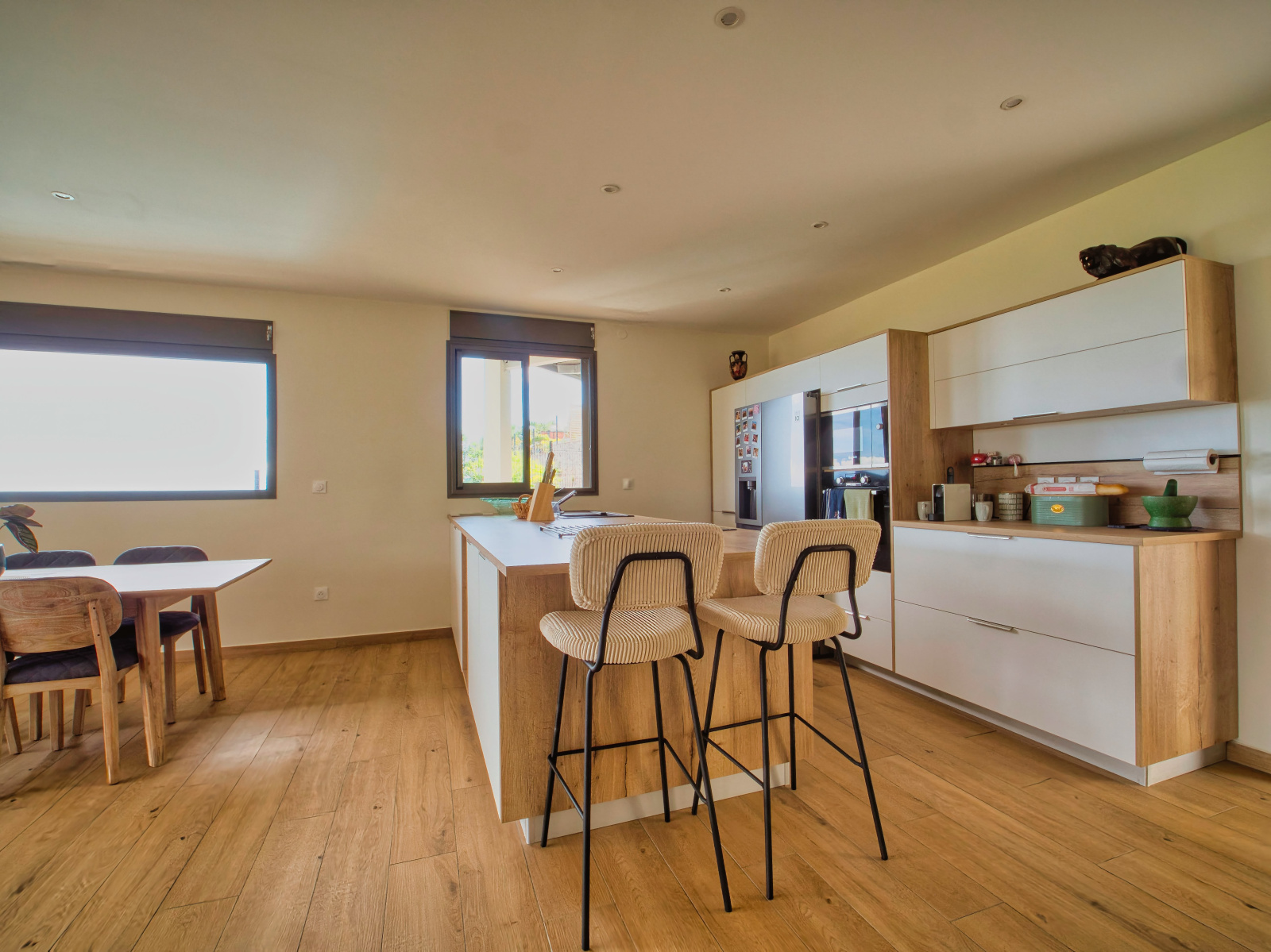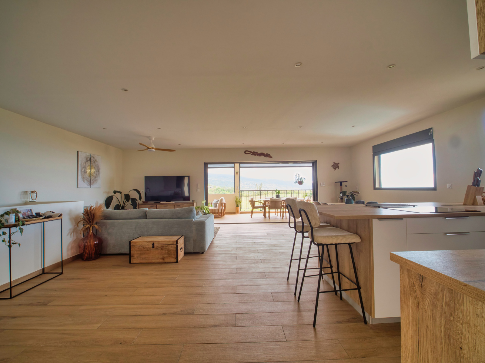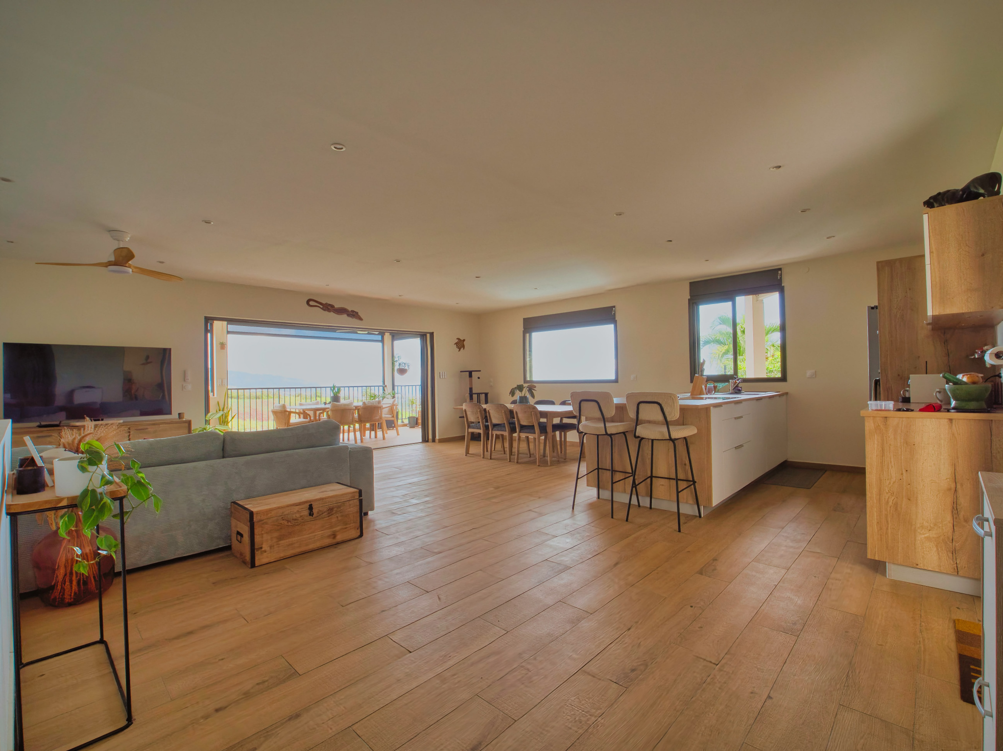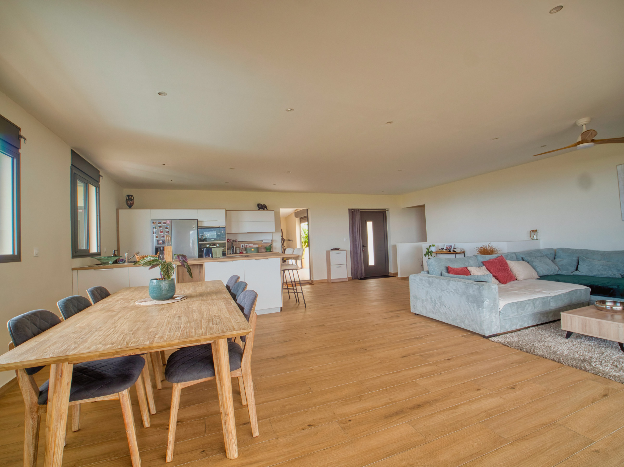 Une cuisine ouverte sur un spacieux séjour, offrant une surface totale de 56 m²